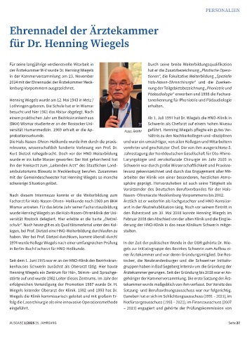 2024 mit der Ehrennadel der Ärztekammer Meck- Hals-Nasen-Ohrenchirurgie“ und die Zuerken-
