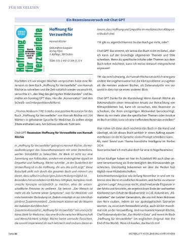 Chat GPT: Rezension: Hoffnung für Verzweifelte von Hannah überlegt, ob ich dieses Buch wirklich in einen Auftrag zusam-